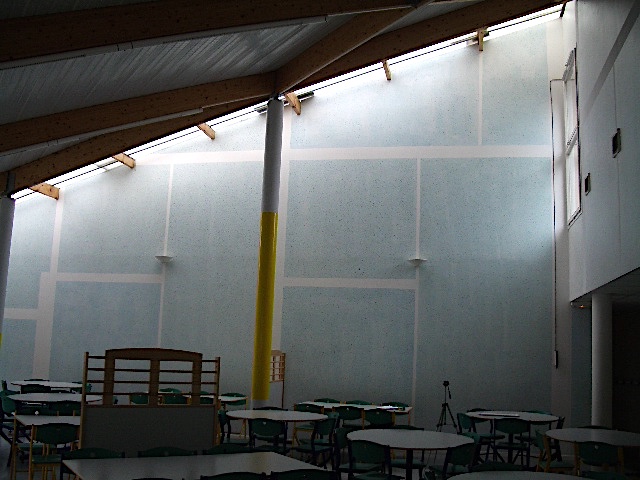 Néanmoins, de grandes surfaces vitrées faisaient face à des murs réfléchissants, augmentant le bruit localement, d'autant plus que le sol était en carrelage. Dans la cantine de l'école du Plateau, le temps de réverbération moyen était trop élevé pour son volume et nettement supérieur à 0,8s.